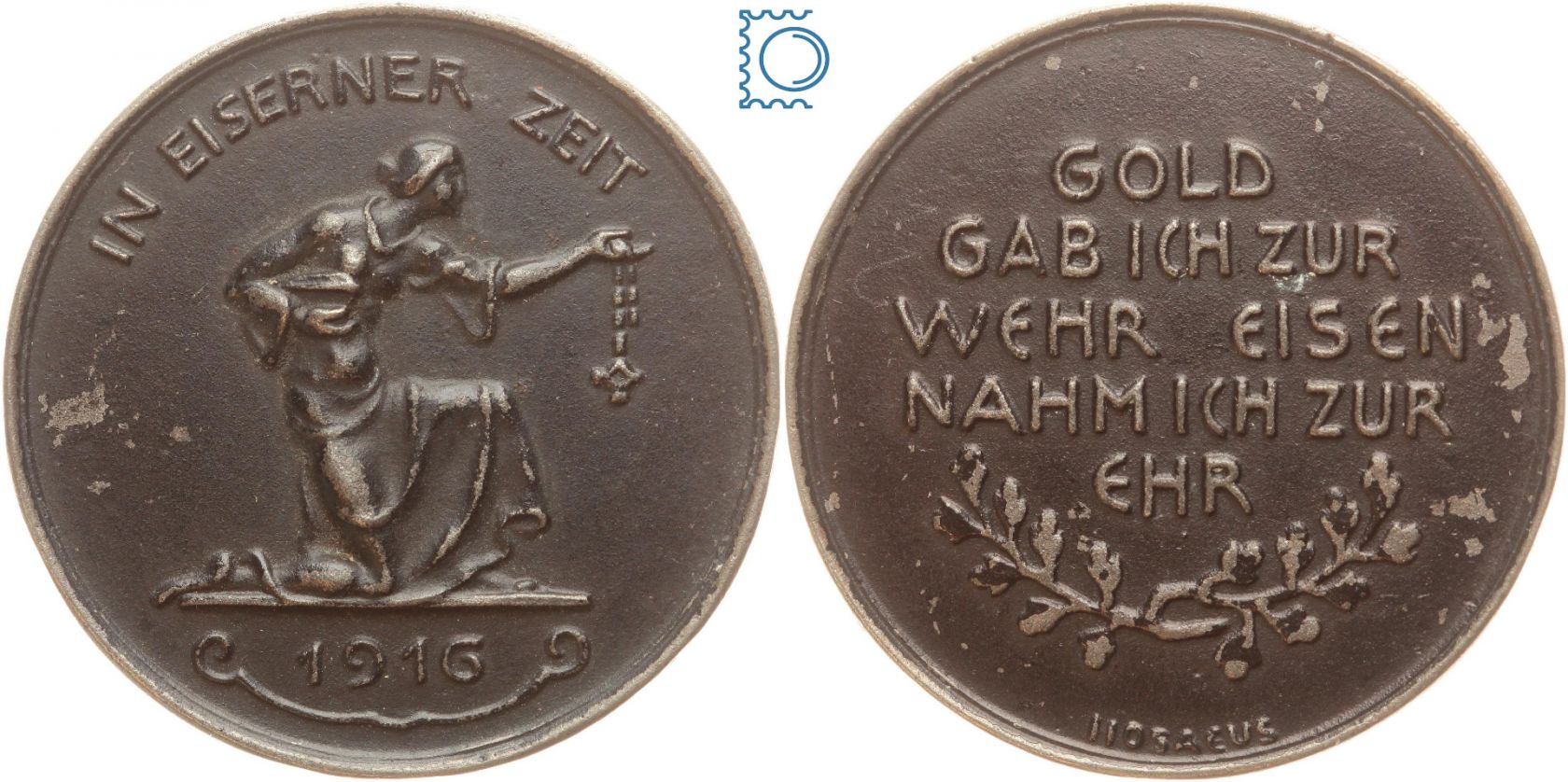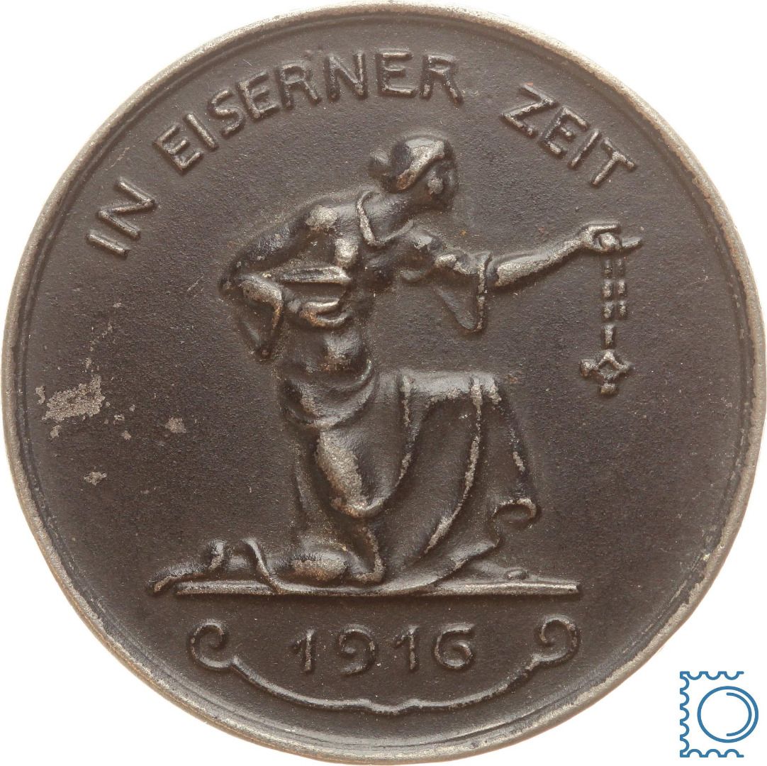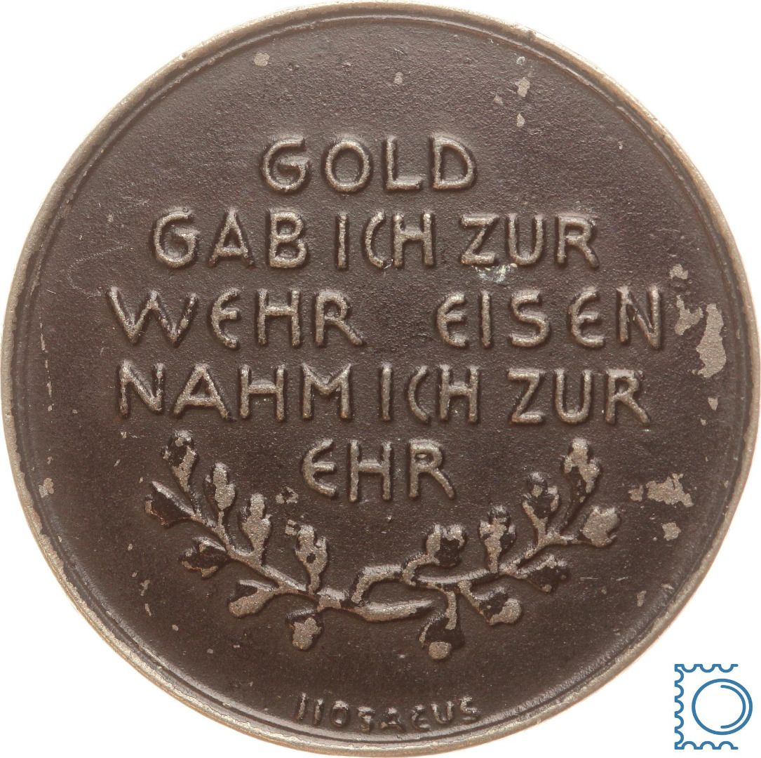 1916 belohnte die Reichsbank die Abgabe von Schmuck oder den Tausch von Gold gegen Papiergeld (das schnell an Wert verlor) mit dieser Medaille. Edelmetalle wie Gold und Silber waren kriegs- und devisenwichtige Rohstoffe. Die von Hermann Hosaeus entworfenen Medaillen wurden in vielen Varianten herausgegeben. Sie bestehen aus geschwärztem Eisen.