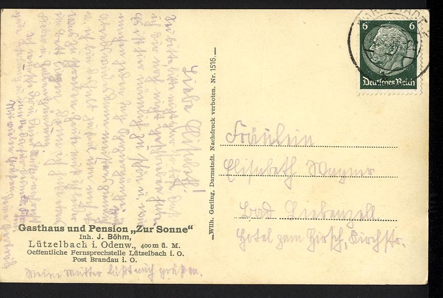 AK 6129 Lützelbach, Gasthof Pension zur Sonne, Brandau, 1936 gelaufen
