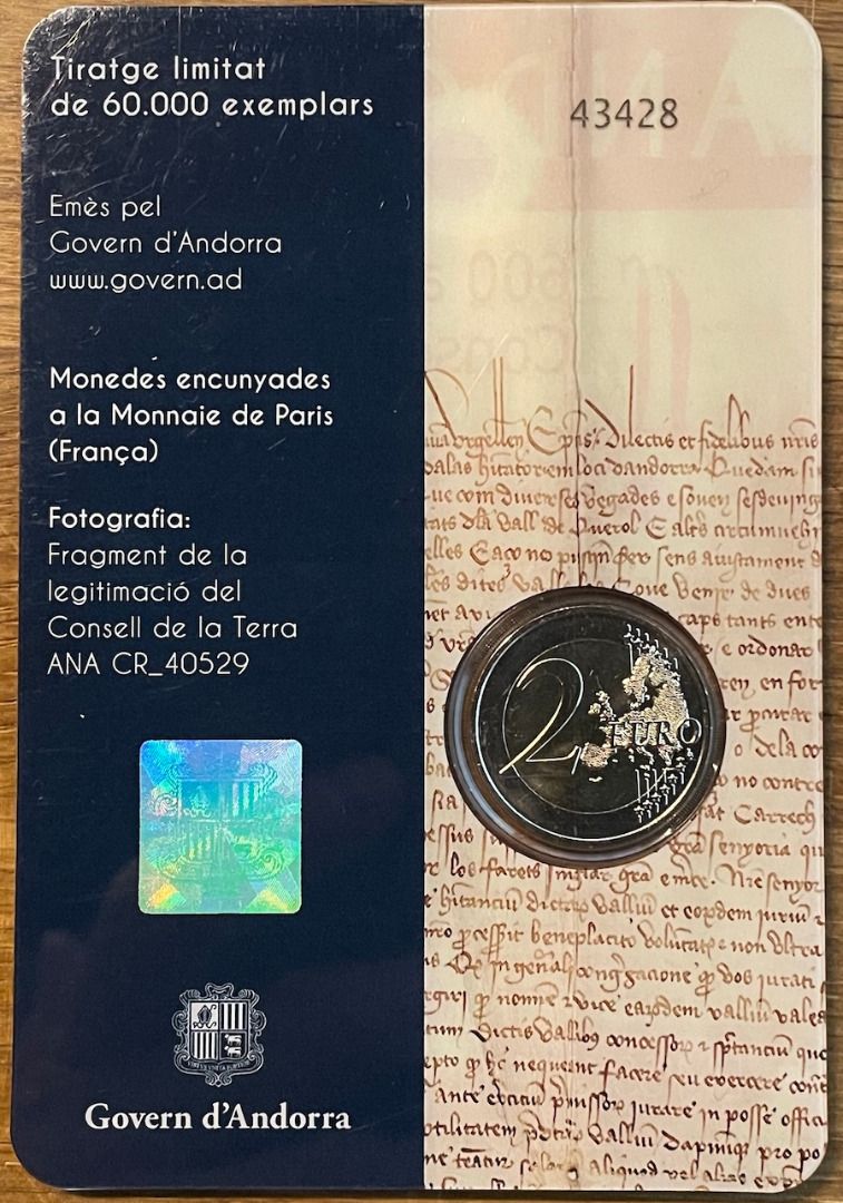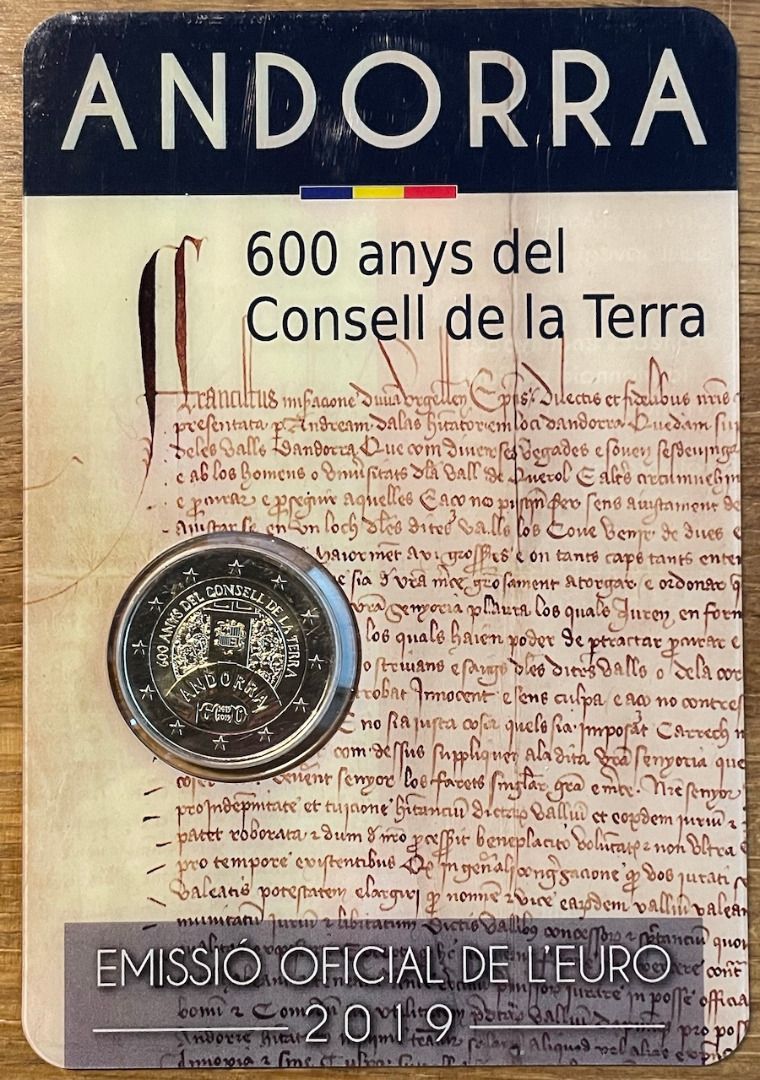ANDORRA 2 Euro 2019 - 600. Jahrestag des Consell de la Terra - original OVP in Coincard