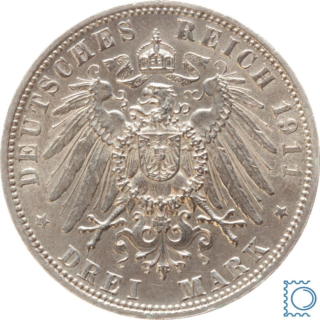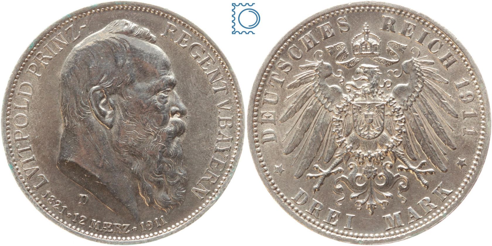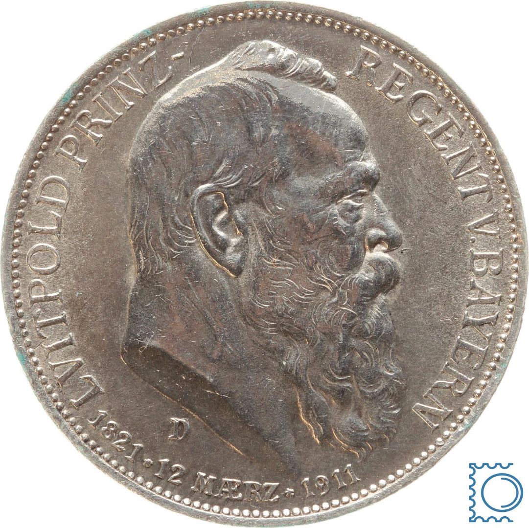 BAYERN, 3 Mark, Prinzregent Luitpold, 1911 D, J.49