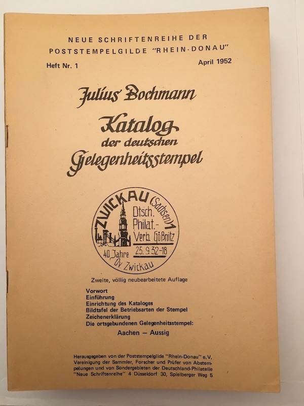 Kataloge der deutschen Gelegenheitsstempel, Julius Bochmann, Heft 1 (Aachen-Aussig), April 1952, 52 Seiten brochiert mit zahlreichen Abbildungen.