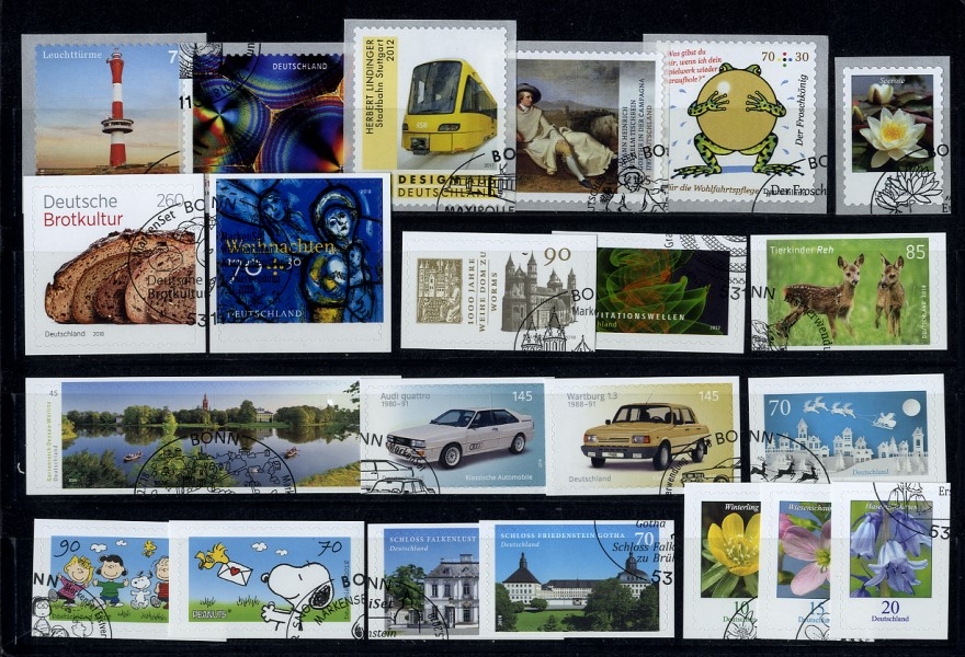 Alle selbstklebenden Briefmarken mit Ersttagsonderstempel wie von der Versandstelle im Abo geliefert.