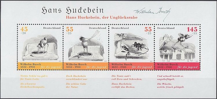 Wilhelm Busch (1832-1908) gilt bis heute als einer der bedeutendsten humoristischen Dichter und Zeichner Deutschlands. Sein Werk Max und Moritz von 1865 wurde neben dem Struwwelpeter von Heinrich Hoffmann zum weltweit bekanntesten deutschen Kinderbuch. Es folgten weitere bekannte Geschichten wie Die fromme Helene, Fips der Affe oder Maler Klecksel. 1867 erschien die Bildergeschichte Hans Huckebein, der Unglücksrabe. Vier aufeinander folgende Zeichnungen daraus sind auf den Sonderbriefmarken des Blocks zum 175. Geburtstag Buschs zu sehen. So bilden die Briefmarken einen Comicstrip - zu Ehren des Mannes, der oft als Urvater des Comics bezeichnet wird.