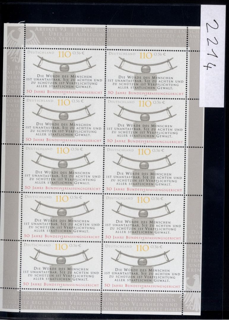 Bund, Michel Nr. 2214 Zehnerbogen postfrisch - Bundesverfassungsgericht