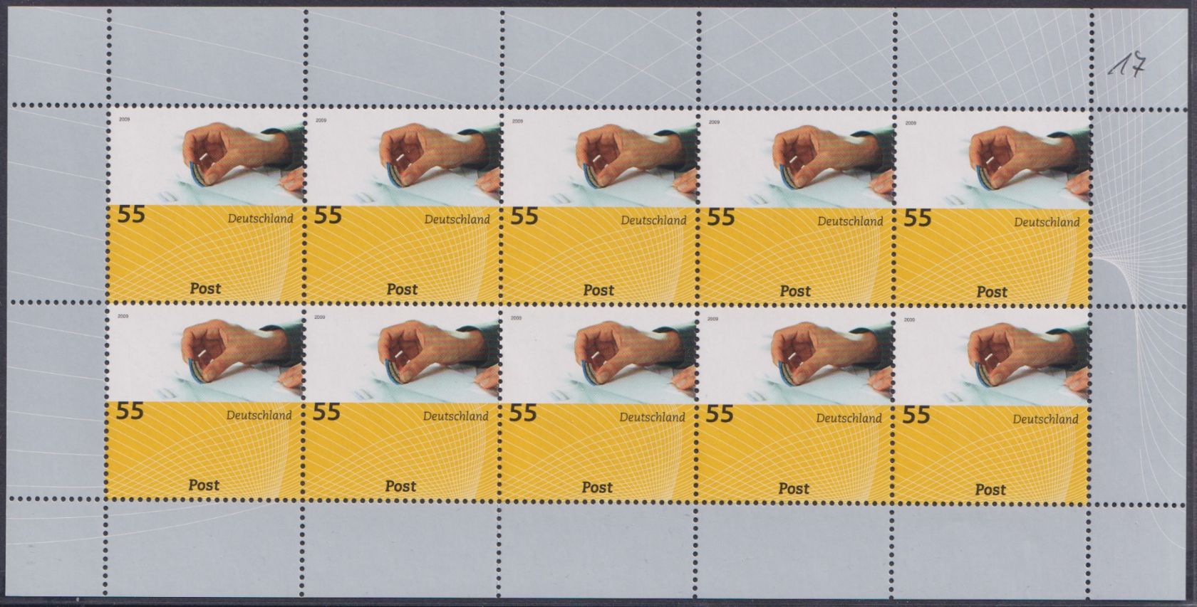 In der Serie Post erscheinen 2009 insgesamt vier Briefmarken an zwei Ausgabetagen. Die vier Motive auf diesen Marken würdigen die universellen Dienstleistungen der Deutschen Post in Deutschland. Die aktuellen Ausgaben haben die Themen Absender, Postfiliale, die beiden Marken, die am 7. Mai 2009 erscheinen, würdigen den Transport und die Zustellung.