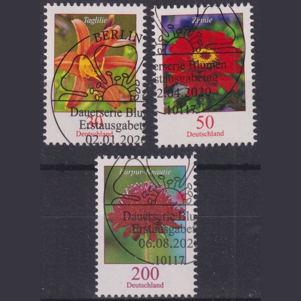 Alle drei Blumenausgaben aus 2020 mit Ersttagsstempel Berlin in tadelloser Erhaltung und original Gummierung.