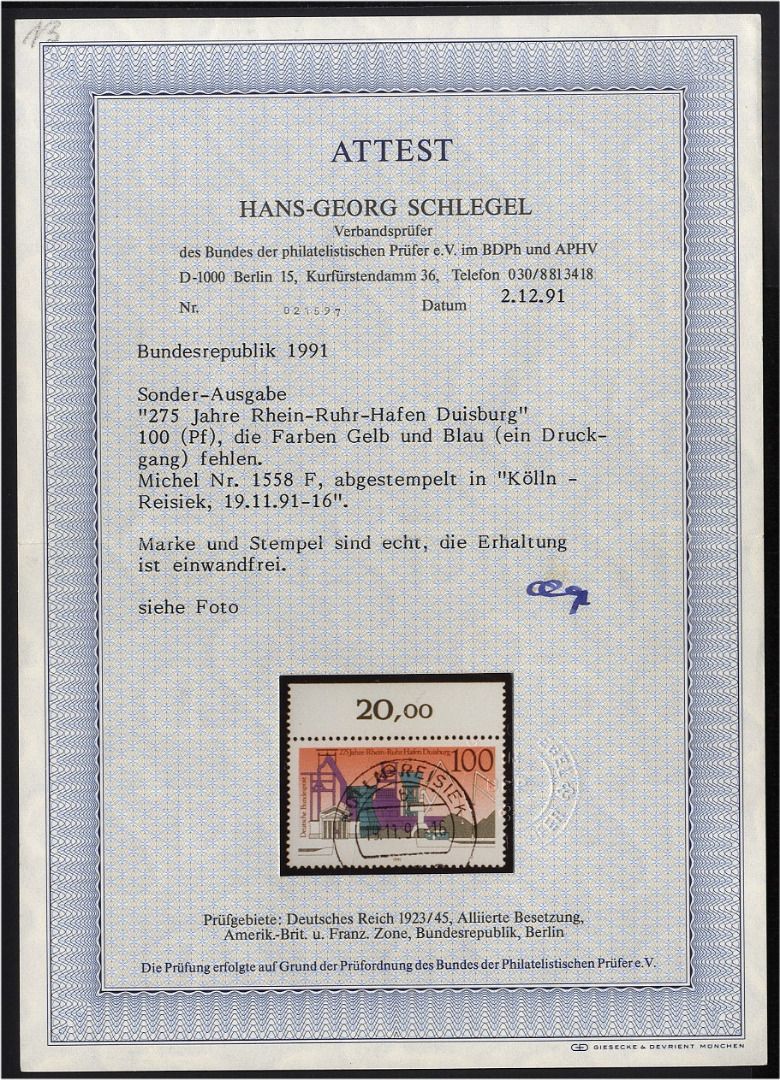 Bund Nr. 1558 F gestempelt - ABART Farbe gelb + blau fehlen - Attest Schlegel BPP