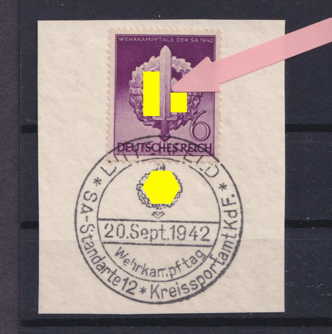Plattenfehler: "S" in Mitte der rechten Schwerthälfte (Feld 22)