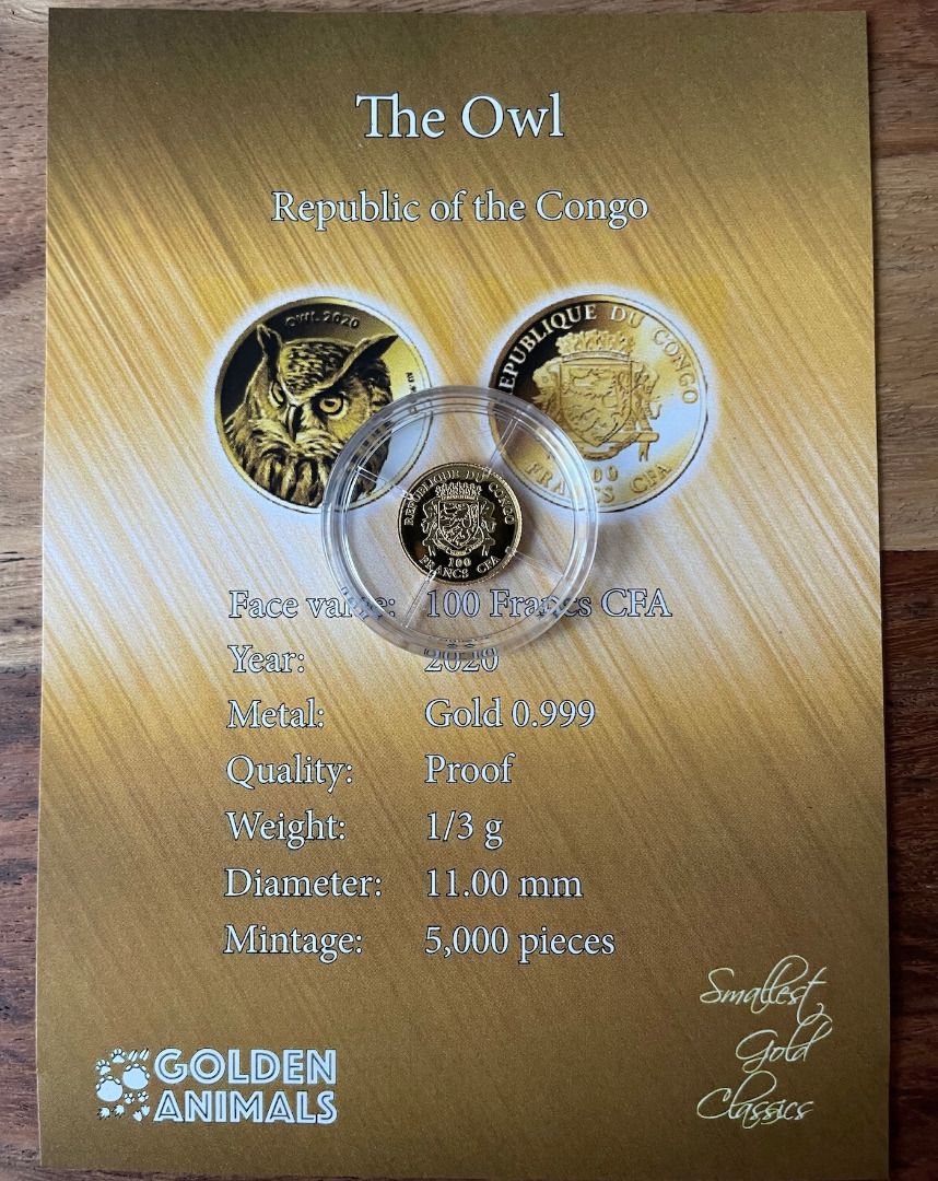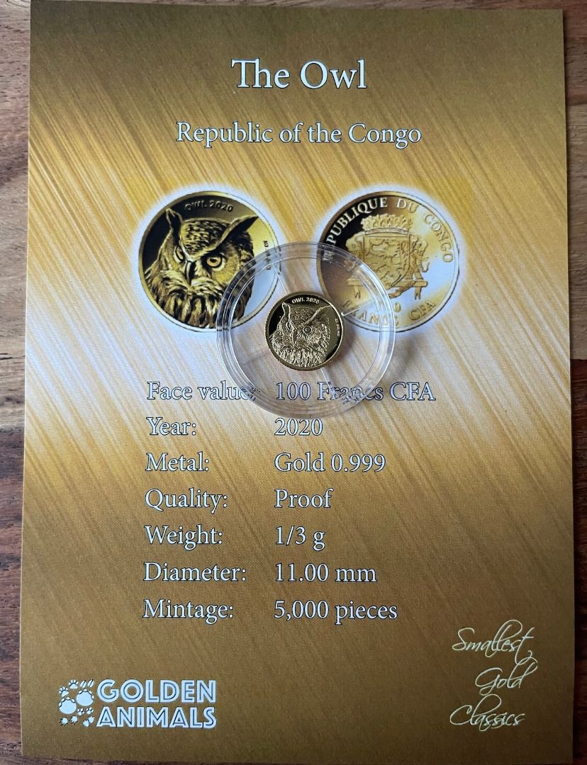 100 Francs KONGO 2020 - ⅓ g Gold 999 - Eule / Owl mit Zertifikat