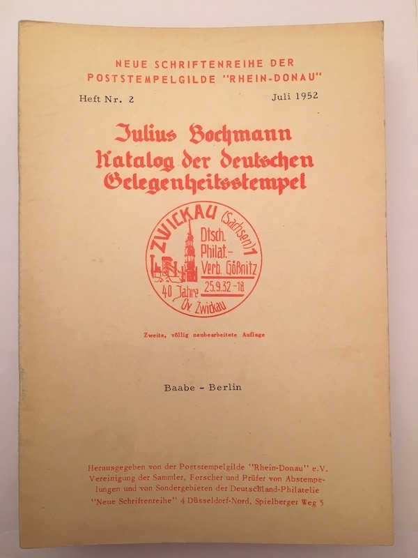 Kataloge der deutschen Gelegenheitsstempel, Julius Bochmann, Heft 2 (Baabe-Berlin), Juli 1952, Seiten 53-100, brochiert mit zahlreichen Abbildungen.