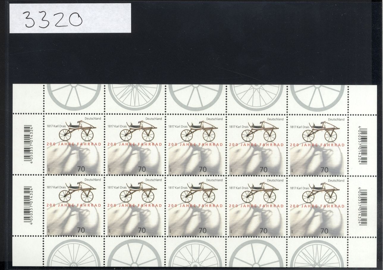 Bund, Michel Nr. 3320 Zehnerbogen postfrisch - 200 Jahre Fahrrad - Karl Drais