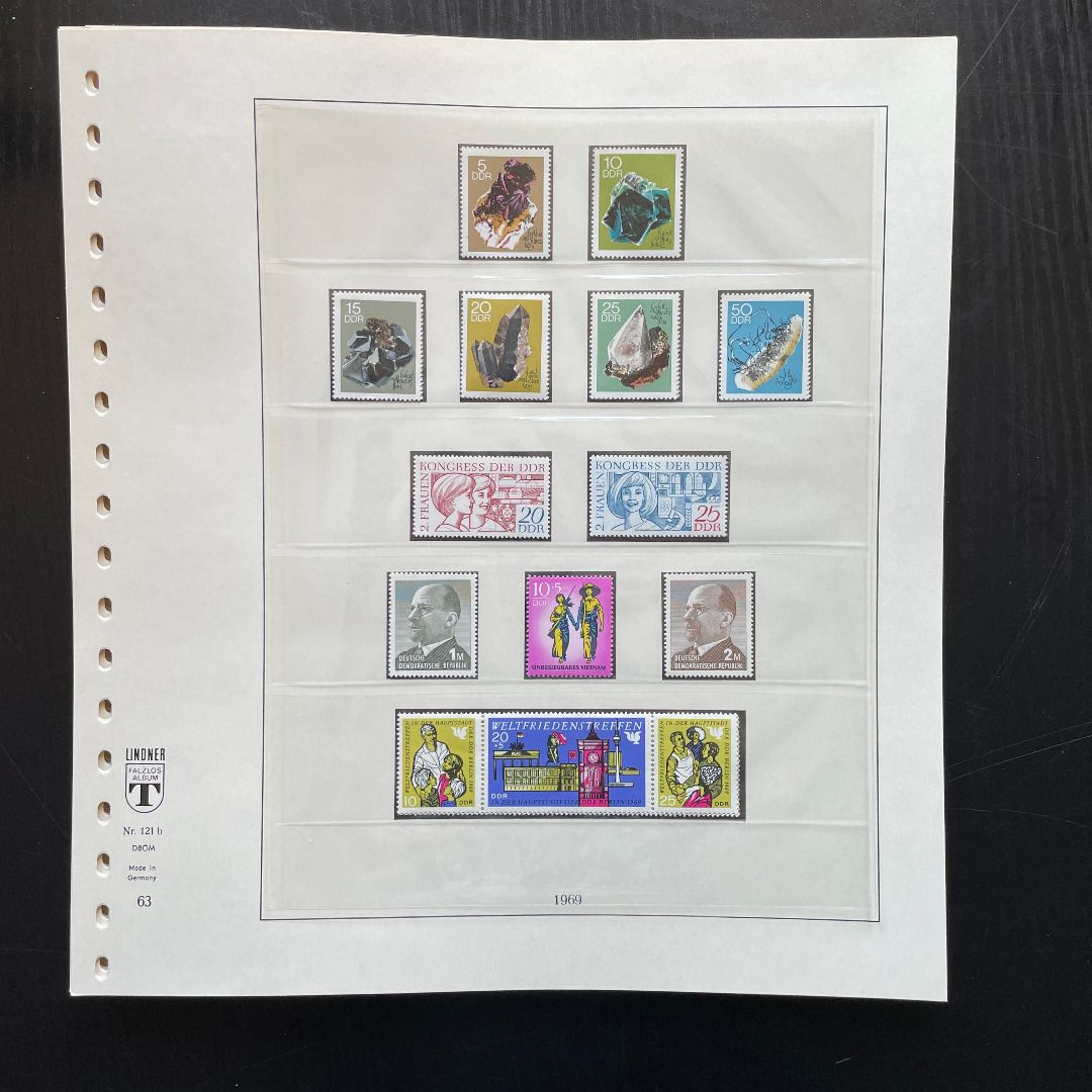 Augenscheinlich komplette postfrische DDR Sammlung auf Lindner Vordruck. Oftmals sind noch gestempelte Briefmarken in den Vordrucken enthalten. Diese Marken wurden mit Falz auf den Abbildungen befestigt.