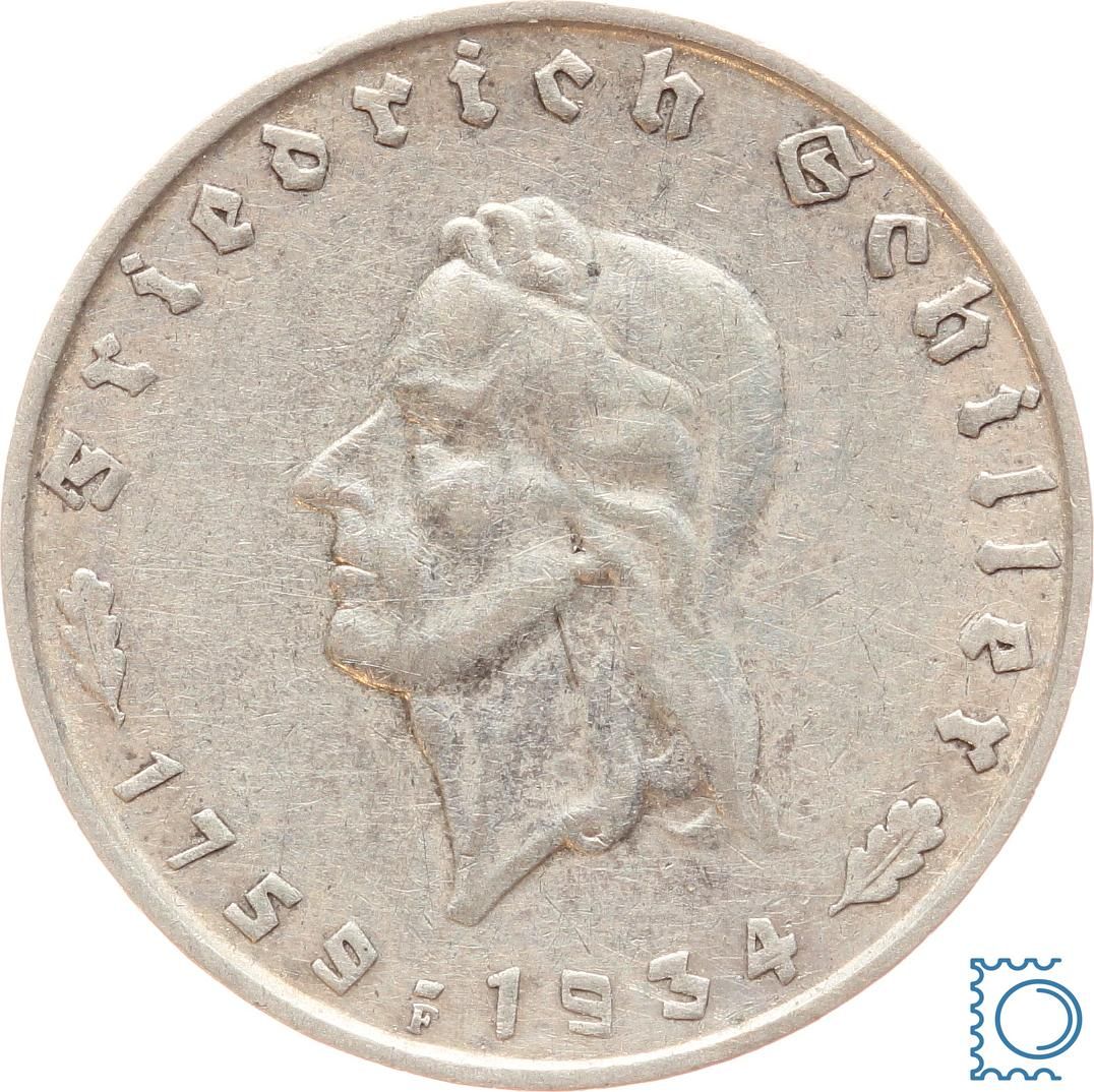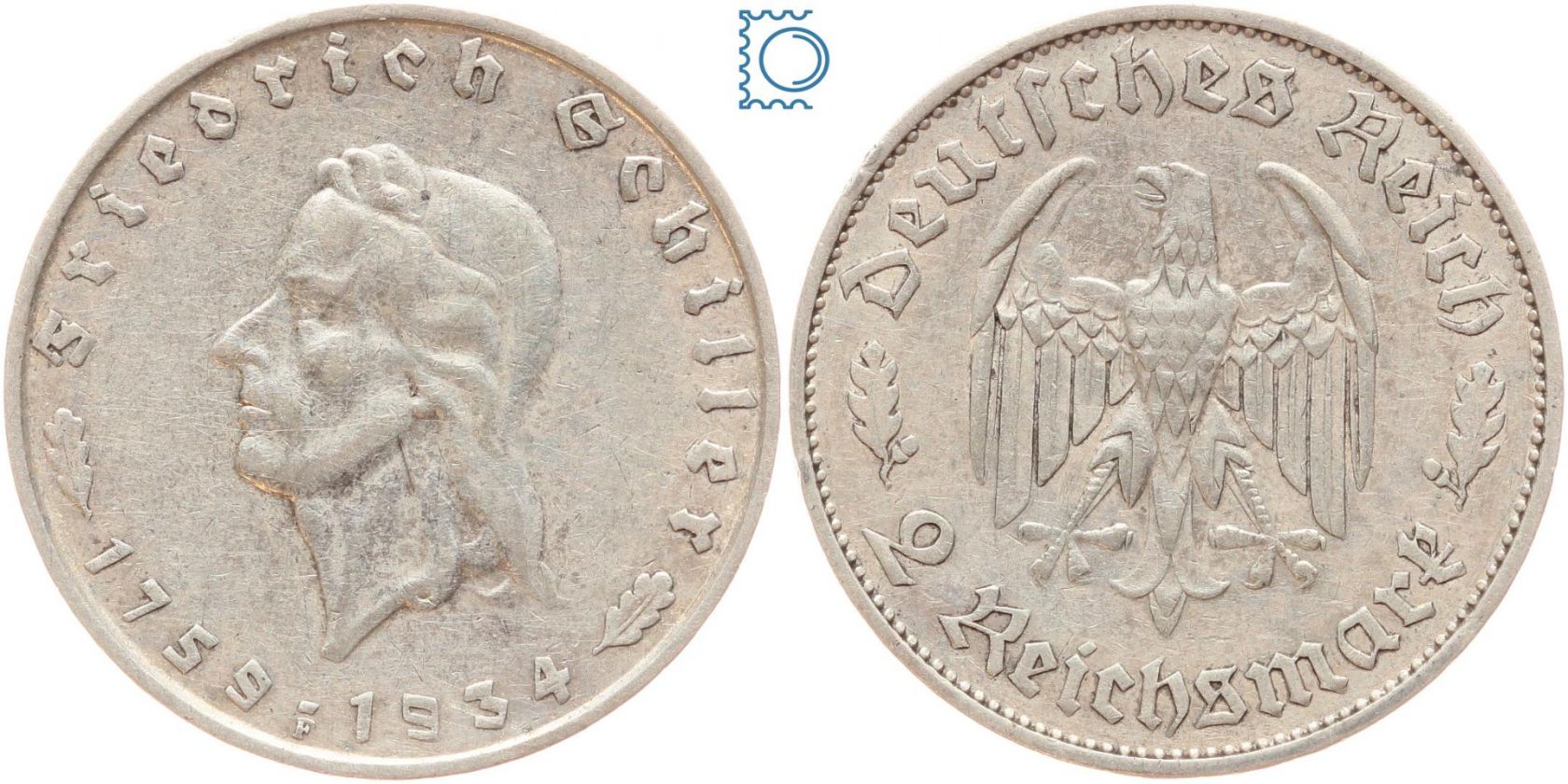Deutsches Reich - 2 Mark 1934 F - Friedrich Schiller - Jäger 358