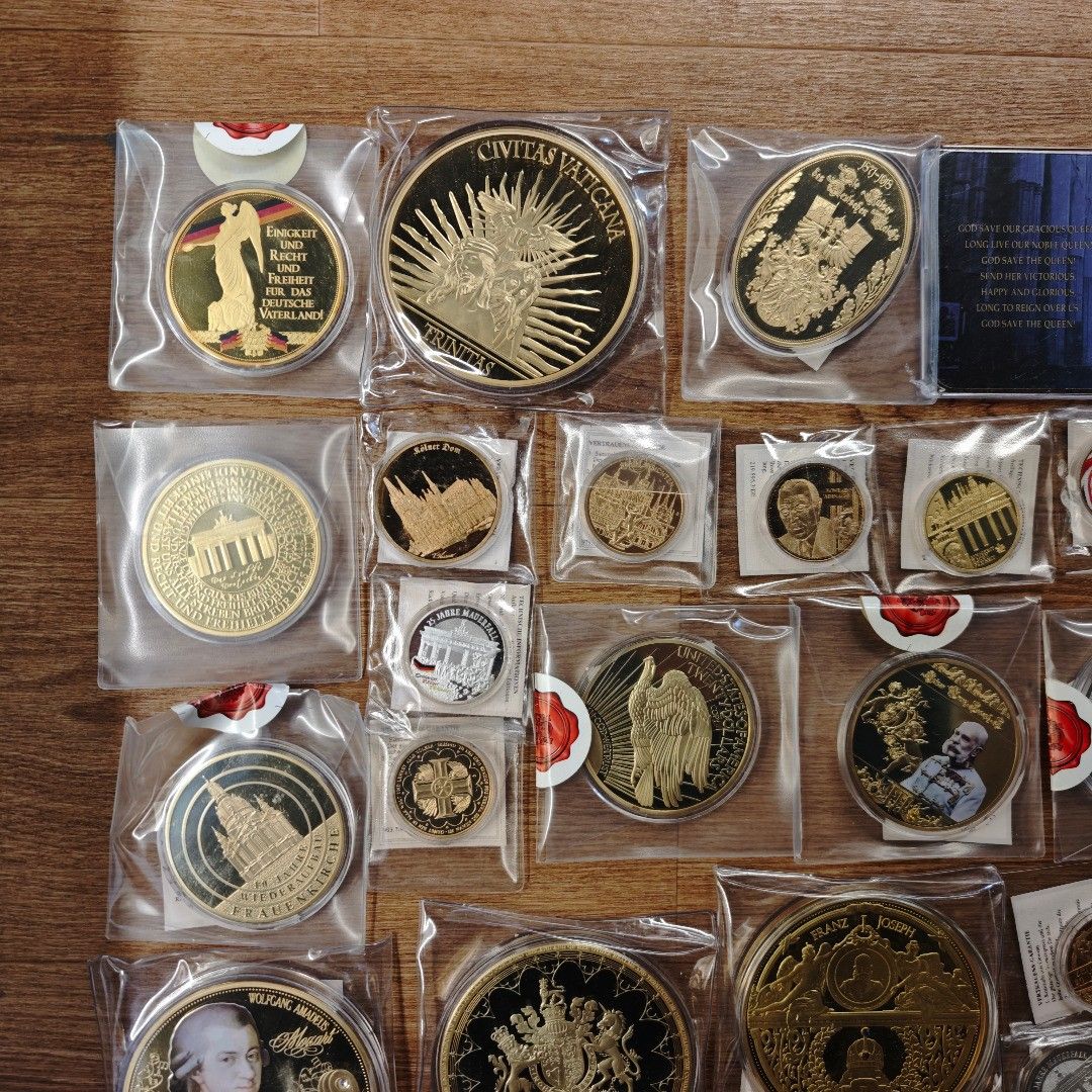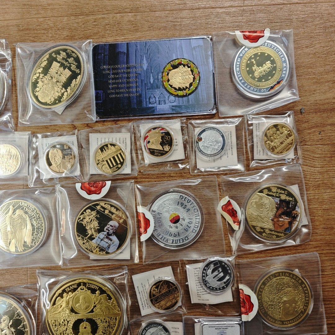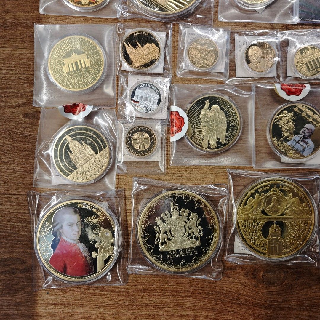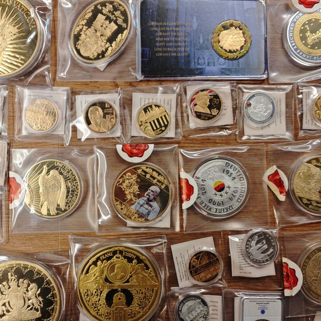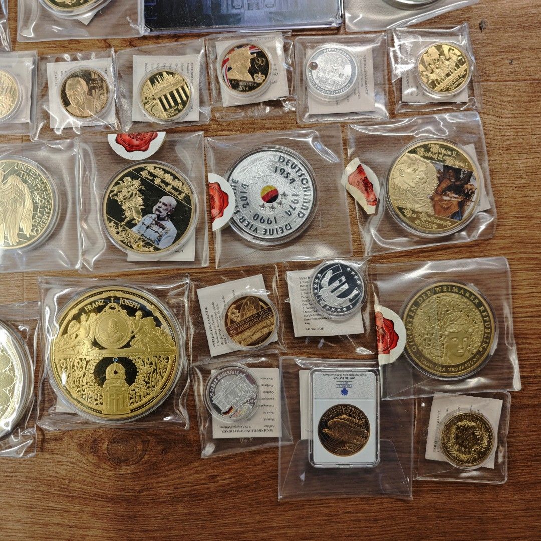 Großes Lot an verschiedenen Münzen, Medaillen aus verschiedenen Ländern. Viele verkapselte und PP Medaillen, vieles versilbert und vergoldet. Schöne Aufräumkiste für Enthusiasten