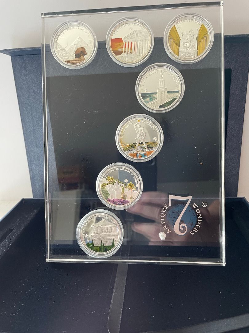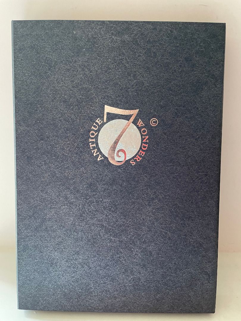 Koloss von Rhodos, Pyramiden von Gizeh, Leuchtturm von Pharos, Mausoleum von Halikarnassos, Hängenden Gärten von Babylon, Artemis Tempel und Zeusstatue des Phidias
