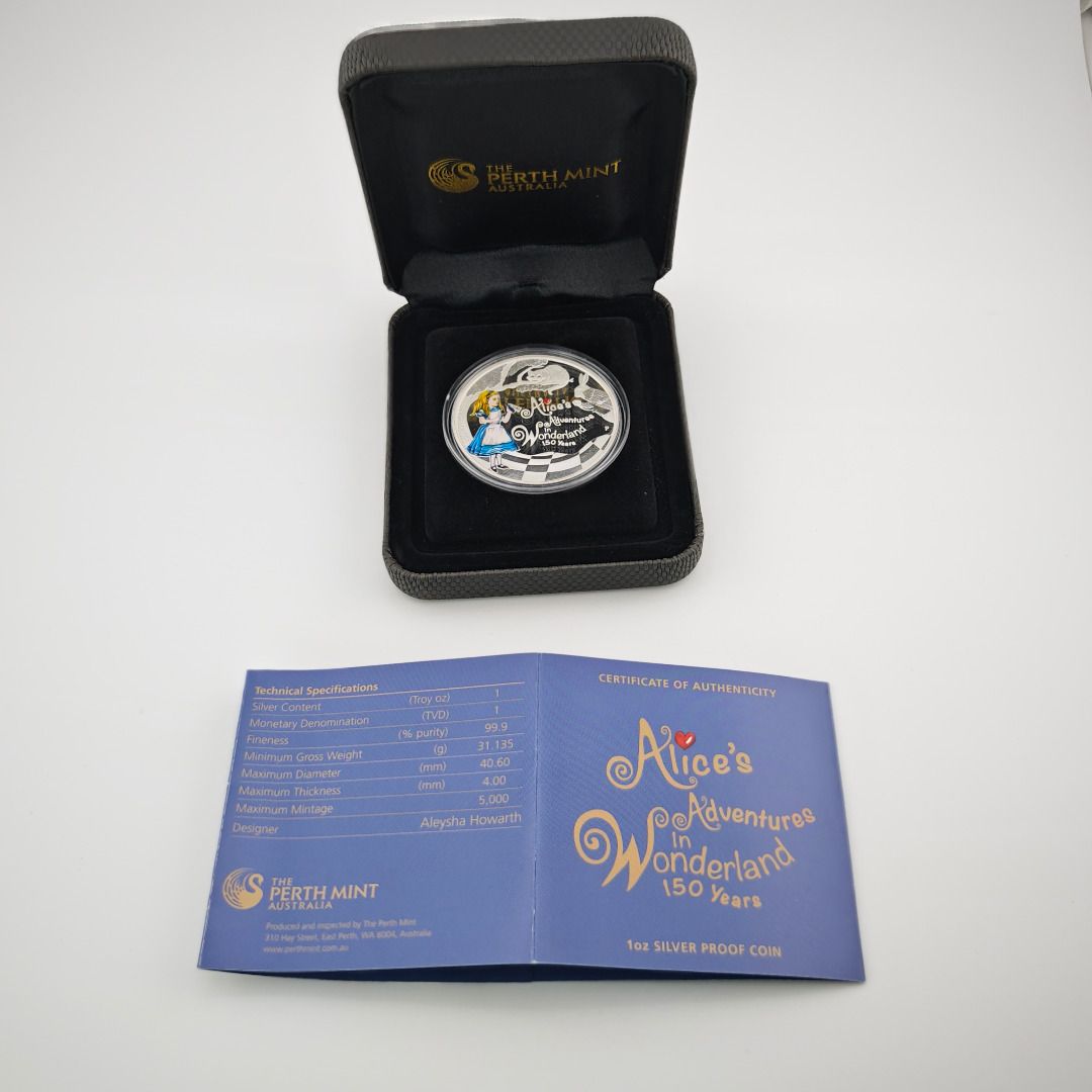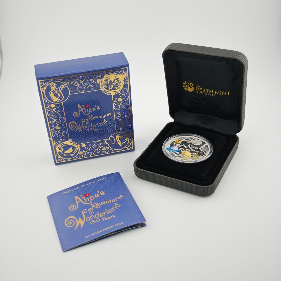 Ein zauberhaftes Sammlerstück, das die zeitlose Geschichte von Alice im Wunderland in edler Prägekunst verewigt.