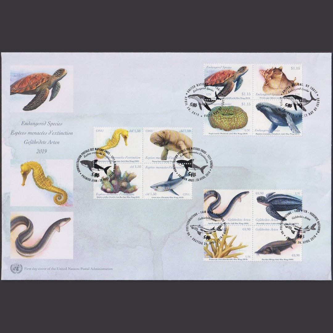 UNO Trio Brief | FDC 2018 | Bedrohte Tierarten | Genf Wien New York