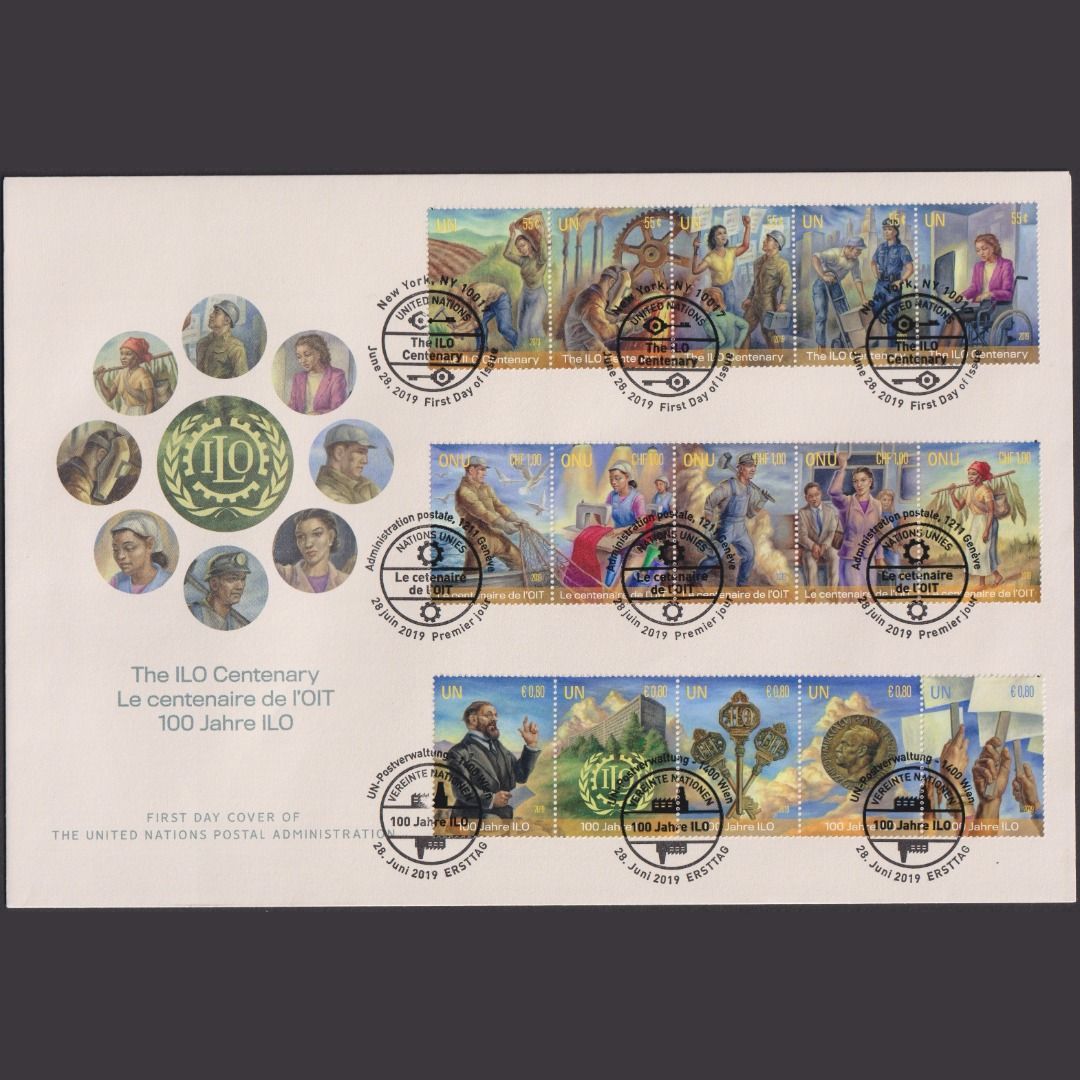 UNO Trio Brief | FDC 2019 | 100 Jahre ILO | Genf Wien New York