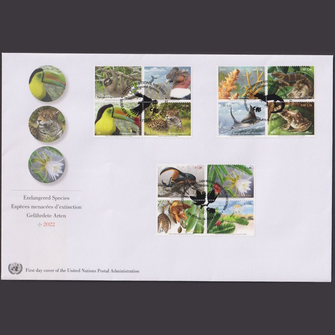 UNO Trio Brief | FDC 2022 | Bedrohte Tierarten | Genf Wien New York