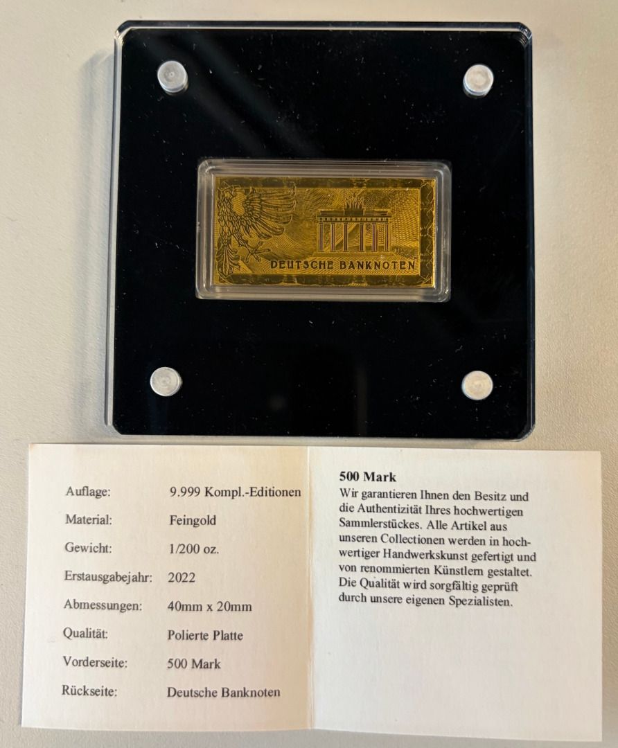 Goldbarren Motivbarren BRD 500 Mark Brandenburger Tor | 1/200 Oz Gold 999 | Feingold