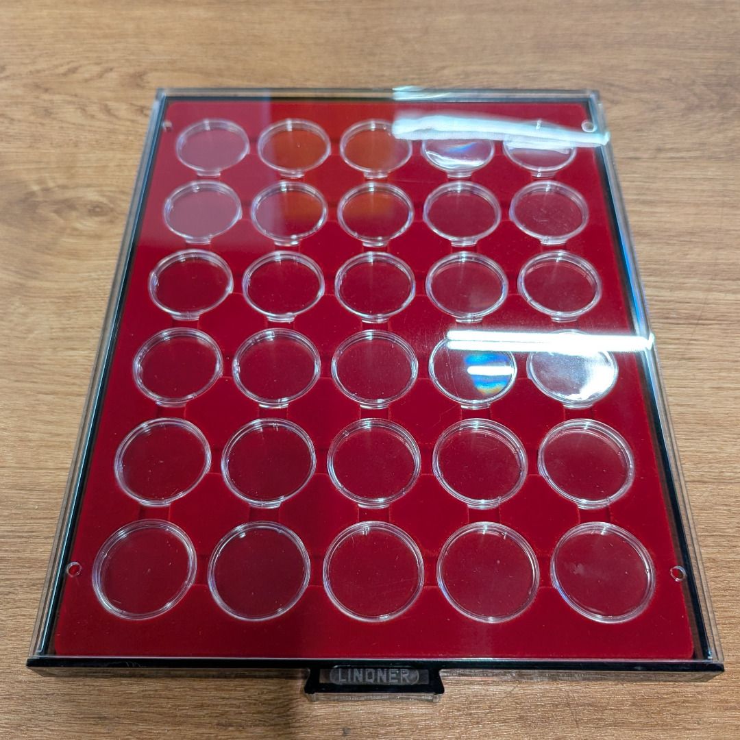 Gebrauchte Lindner Münzboxen Rauchglas - mit runden Vertiefungen, geeignet für verkapselte Münzen und Münzsätze!
