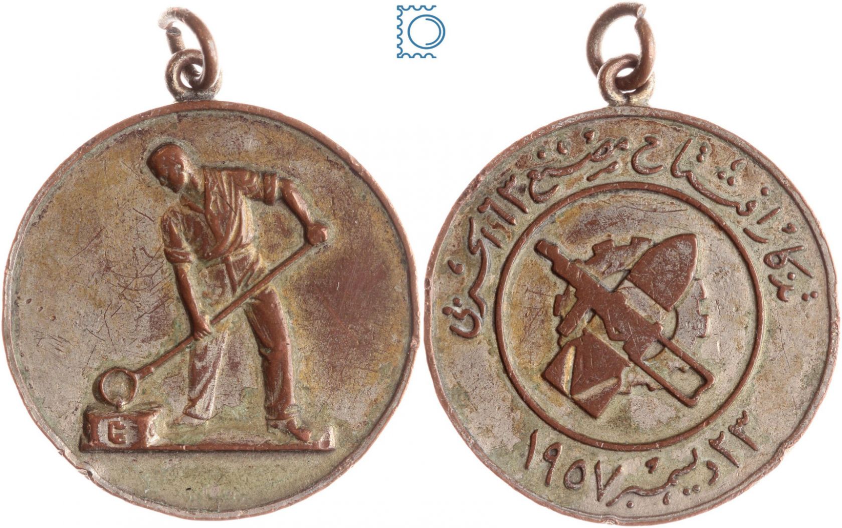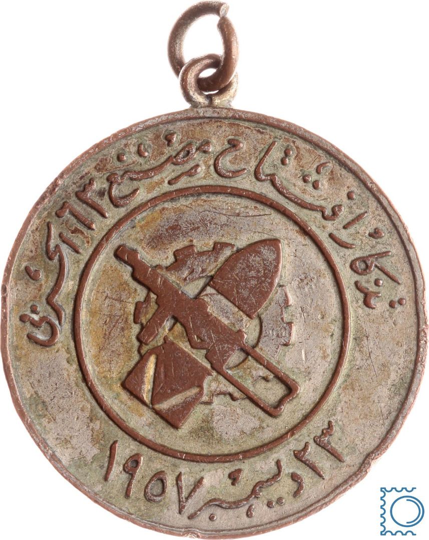 Datum: Unten steht das Datum „٢٣ يونيو ١٩٥٧“ (23. Juni 1957) in arabischen Ziffern. Dies markiert den ersten Jahrestag des vollständigen Abzugs der britischen Truppen im Jahr 1956.