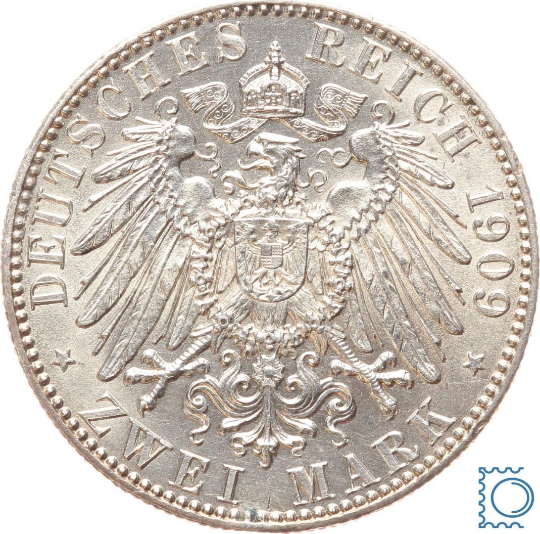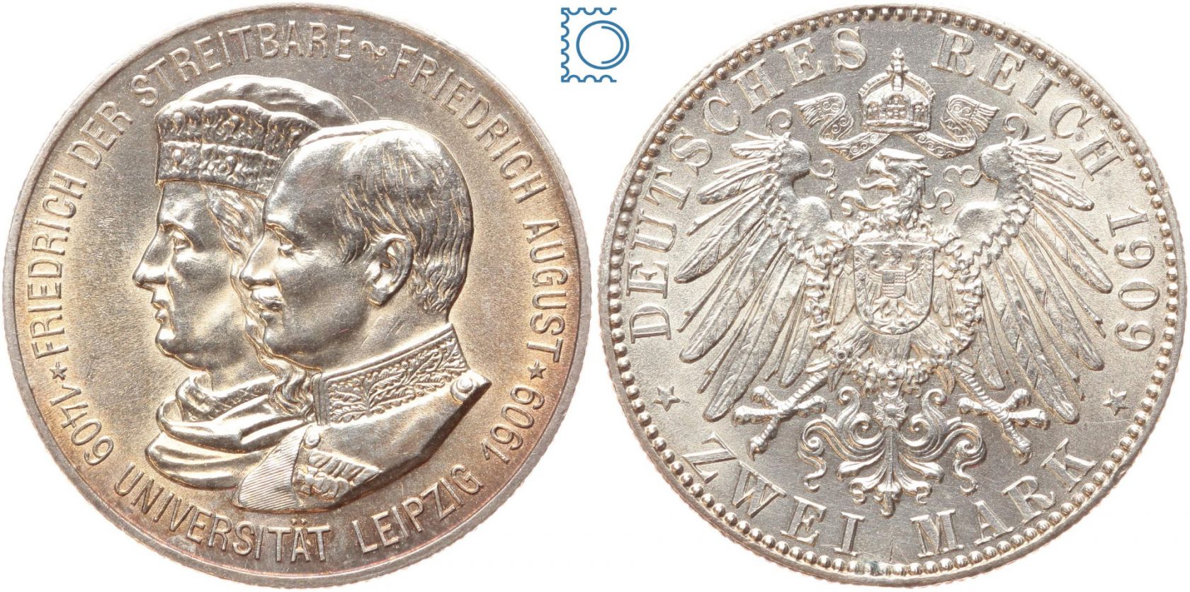 SACHSEN, 2 Mark 1909 E, 500 Jahre UNI Leipzig, Silber Jg. 138