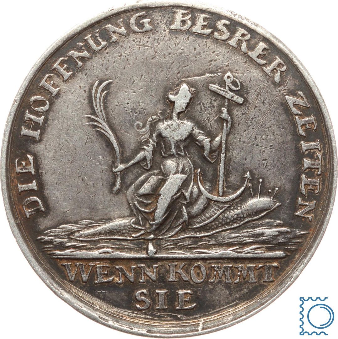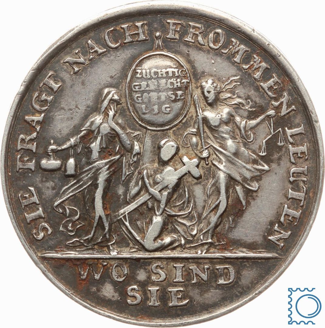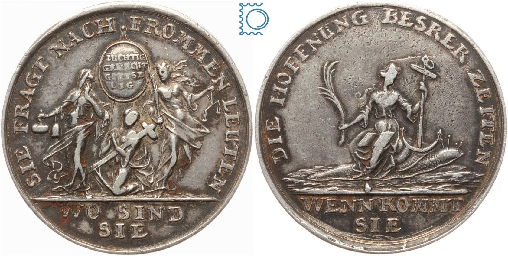Medaille o.J. (1707; unsigniert; Stempel von Philipp Heinrich Müller) auf den Altranstädter Vertrag und die erhoffte Religionsfreiheit in Schlesien. DIE HOFFNUNG BESRER ZEITEN . Sitzende Spes mit Palmzweig und Anker auf Schnecke; im Abschnitt WENN KOMMT / SIE . Rs: SIE FRAGT NACH GUTEN LEUTHEN . Castitas, Religio und Justitia um ovale Tafel; im Abschnitt WO SIND / SIE .