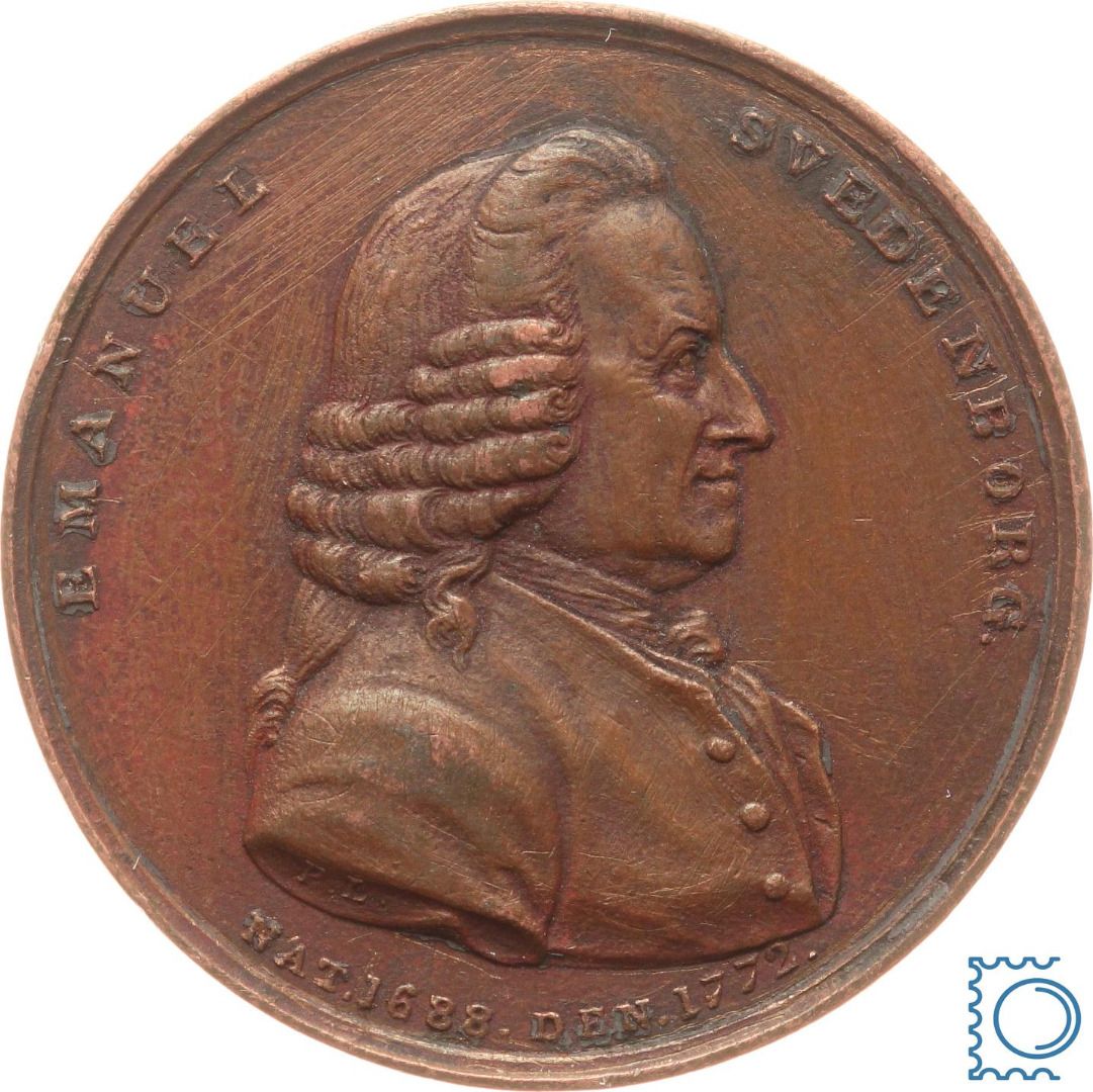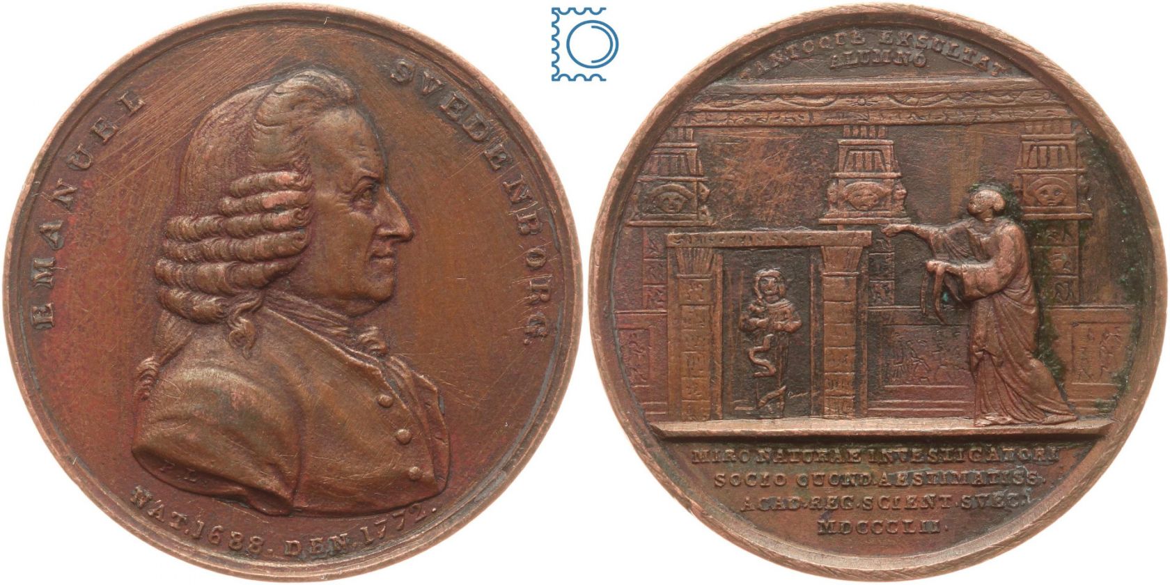 EMANUEL SVEDENBORG. NAT. 1688. DEN. 1772., bust right; P. L. on truncation of bust / Male figure advancing left, holding scroll and pointing to serpent-entwined mumiform figure within Temple of Hathor; TANTOQUE EXSULTAT/ALUMNO. above; MIRO NATURAE INVESTIGATORI/SOCIO QUAND. AESTIMATISS./ACAD. REG. SCIENT. SVEC./MDCCCLII. in four lines in exergue.