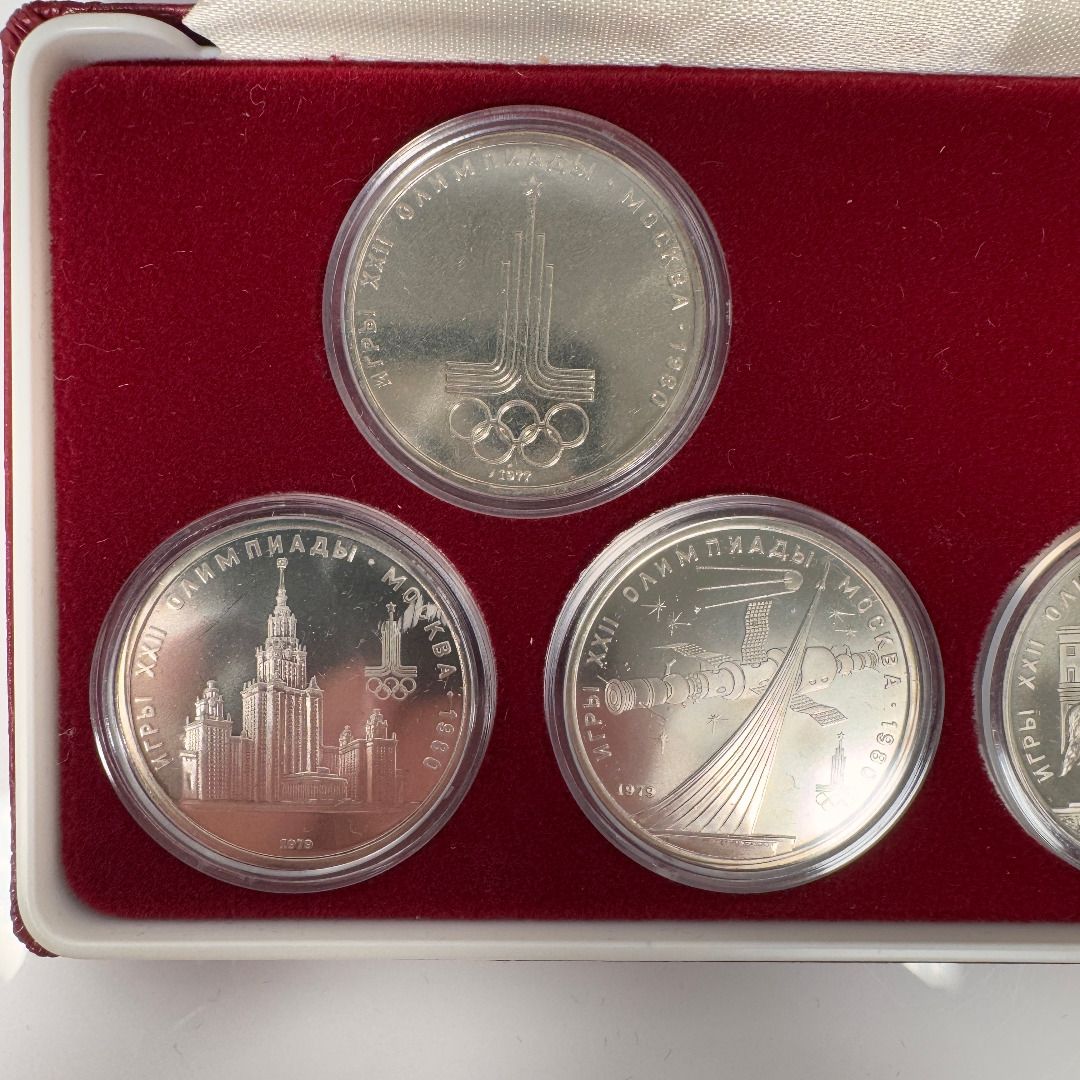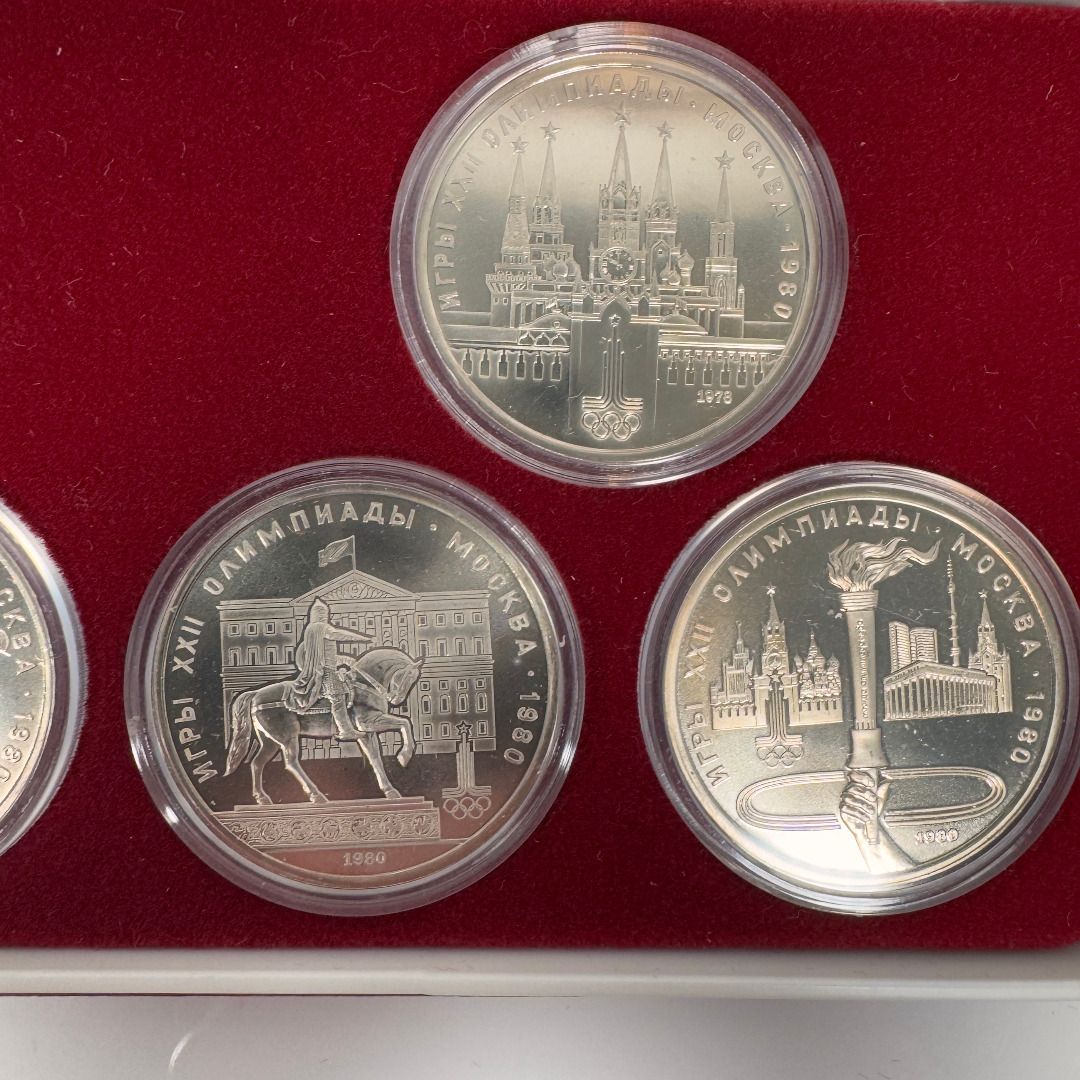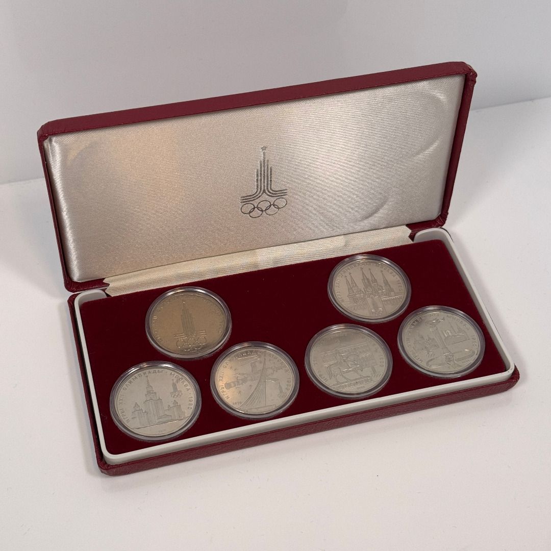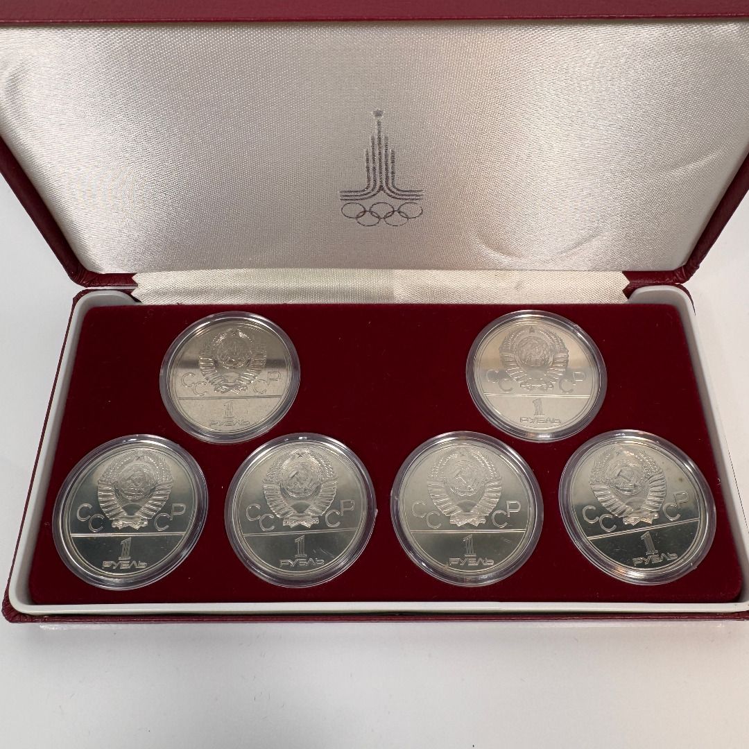 Sechs Münzen, ausgegeben von 1977-1980 der Olympiade 1980 in Moskau, 6x 1 Rubel der Sowjetunion/Russland in Kapseln