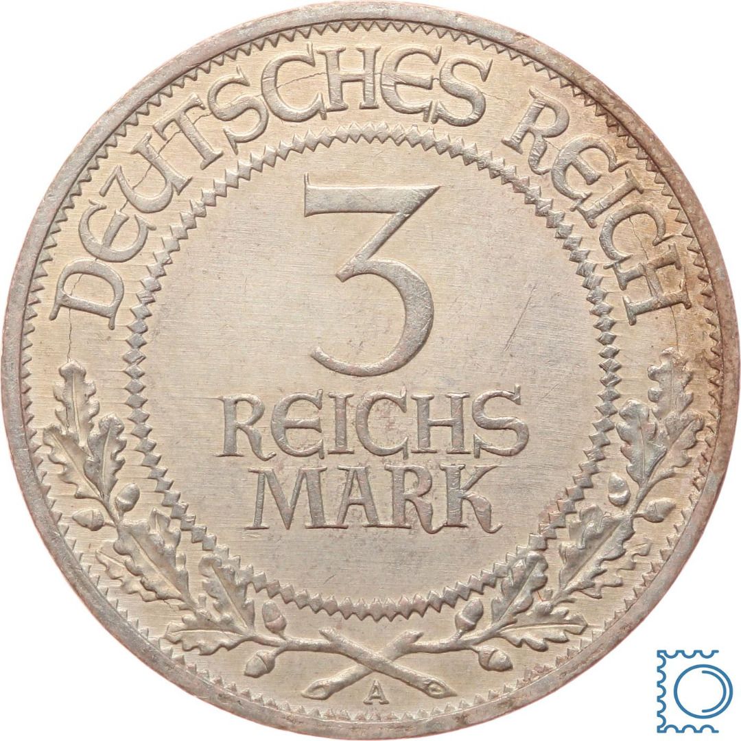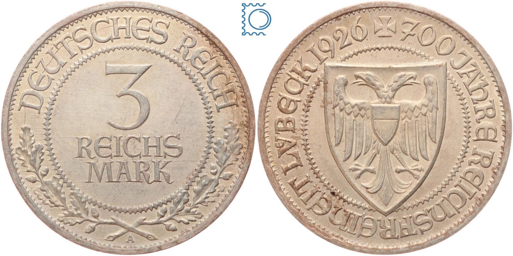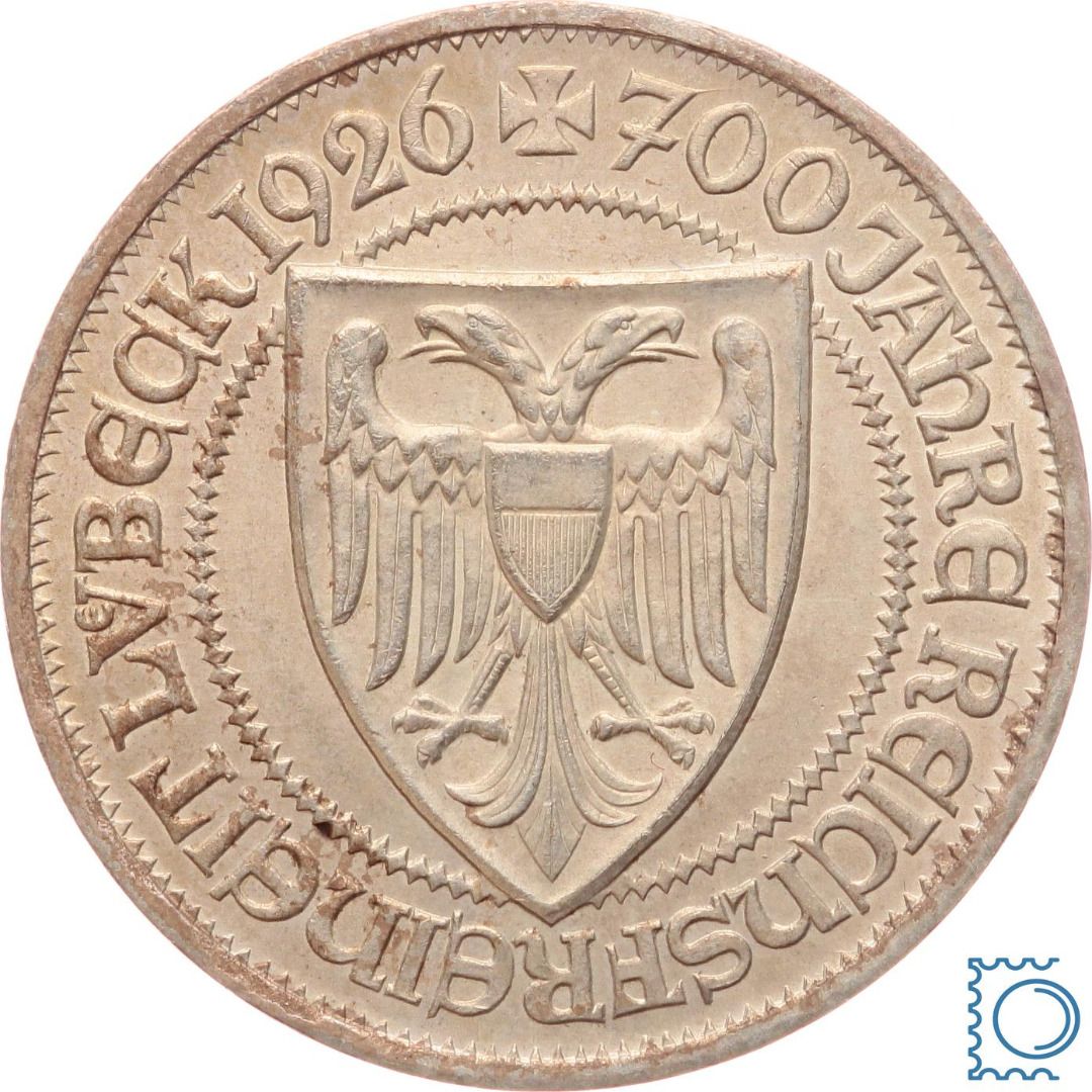 Weimar 3 Mark 1926 A, 700 Jahre Jahre Reichsfreiheit Lübeck, J.323, Silber
