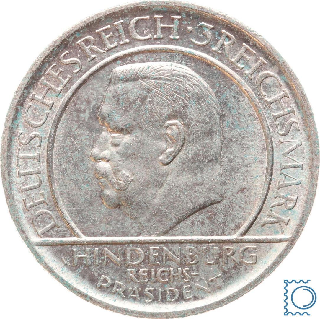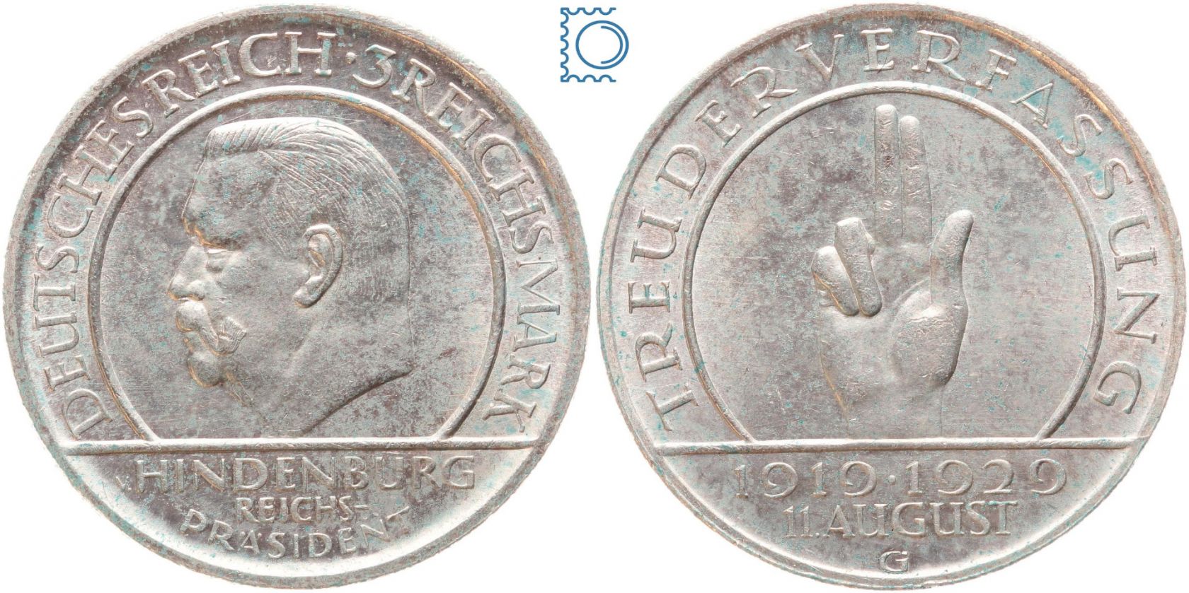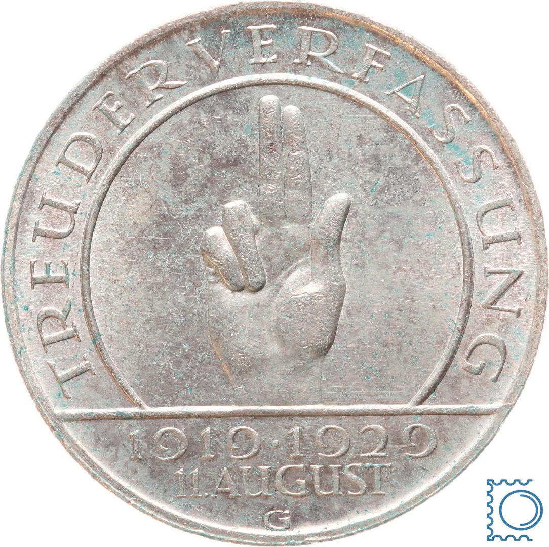 Weimar 3 Mark 1929 G, Schwurhand Hindenburg, J.340, Silber
