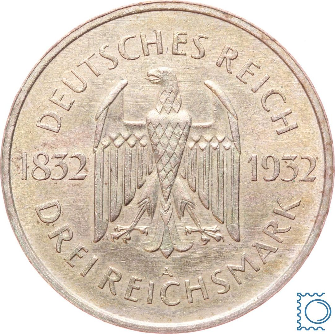 Weimar 3 Mark 1932 A, Johann Wolfgang von Goethe 100. Todestag, J.350, Silber