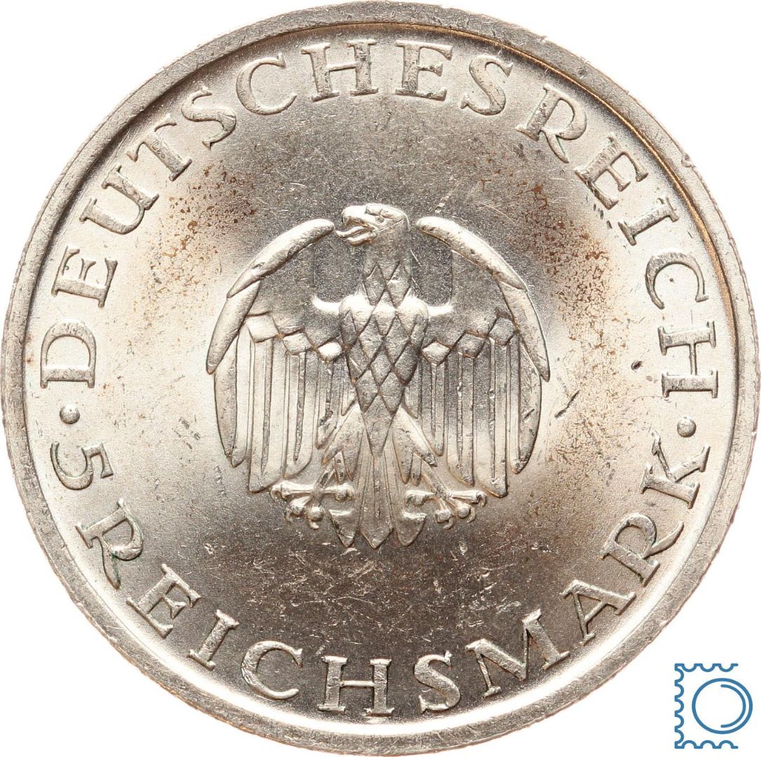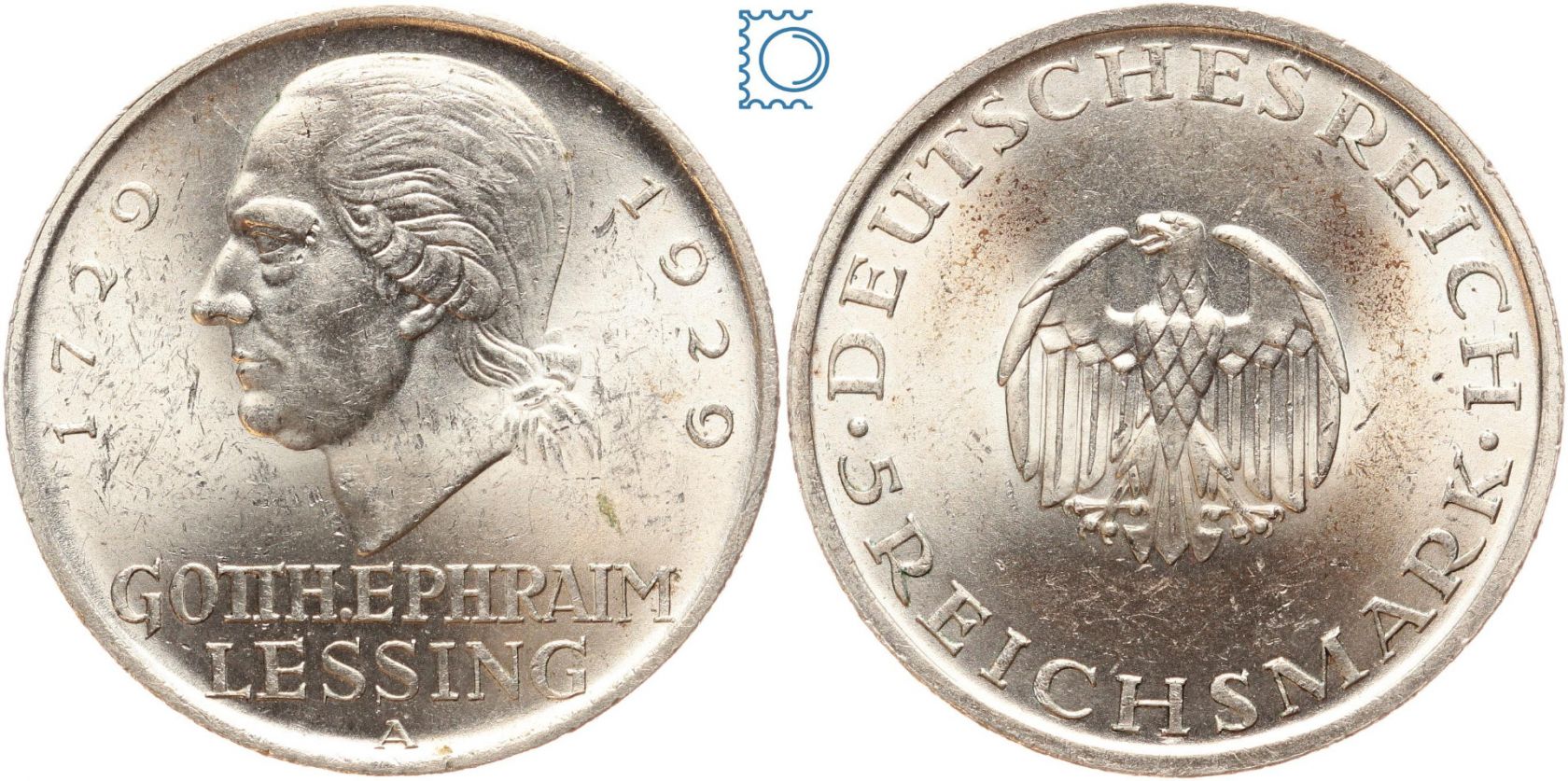 Weimar 5 Mark 1929 A, Gotthold Ephraim Lessing, J.336, Silber