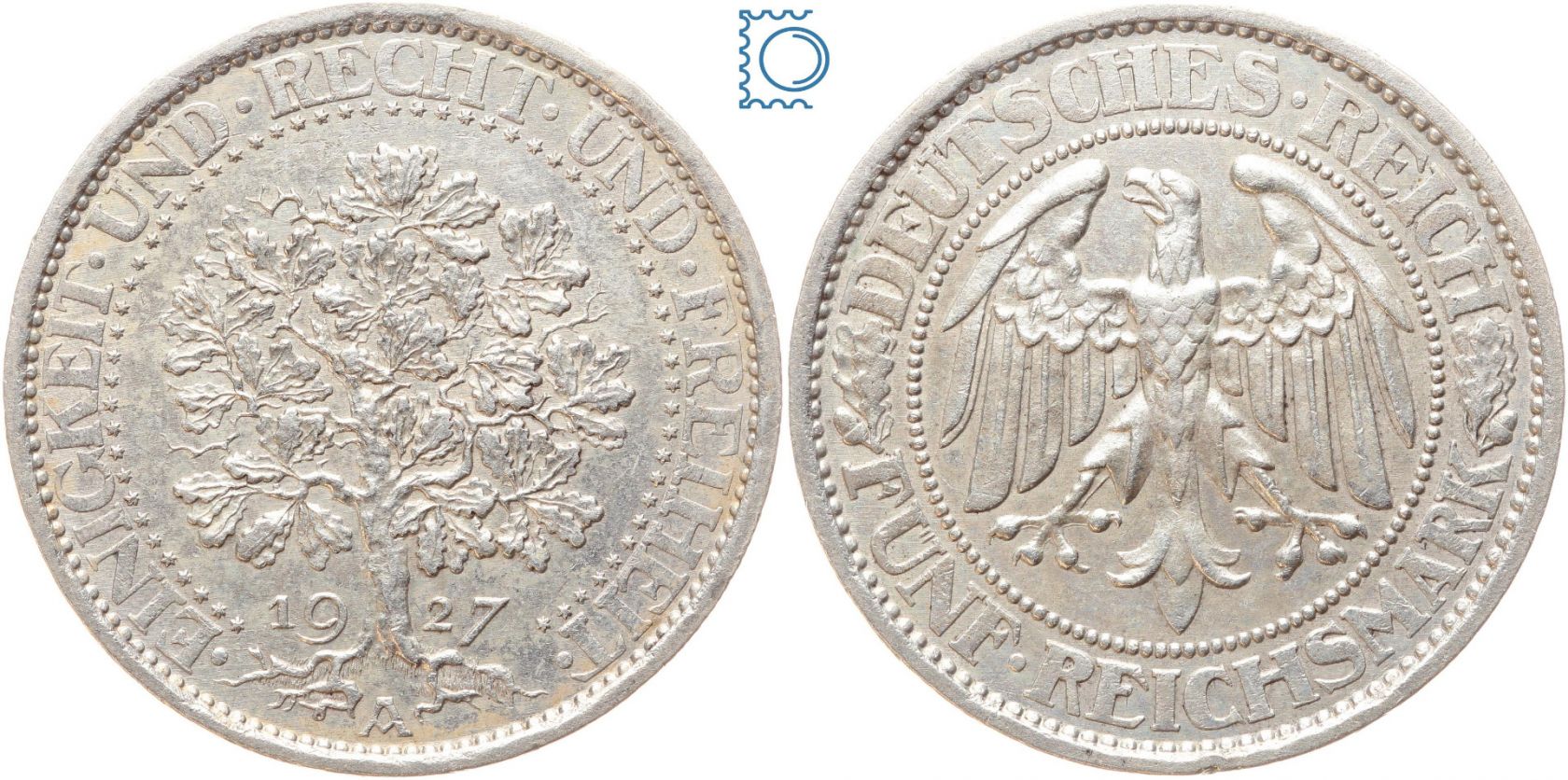 Weimarer Republik 5 Reichsmark 1927 A - Eichbaum - Silber - J. 331