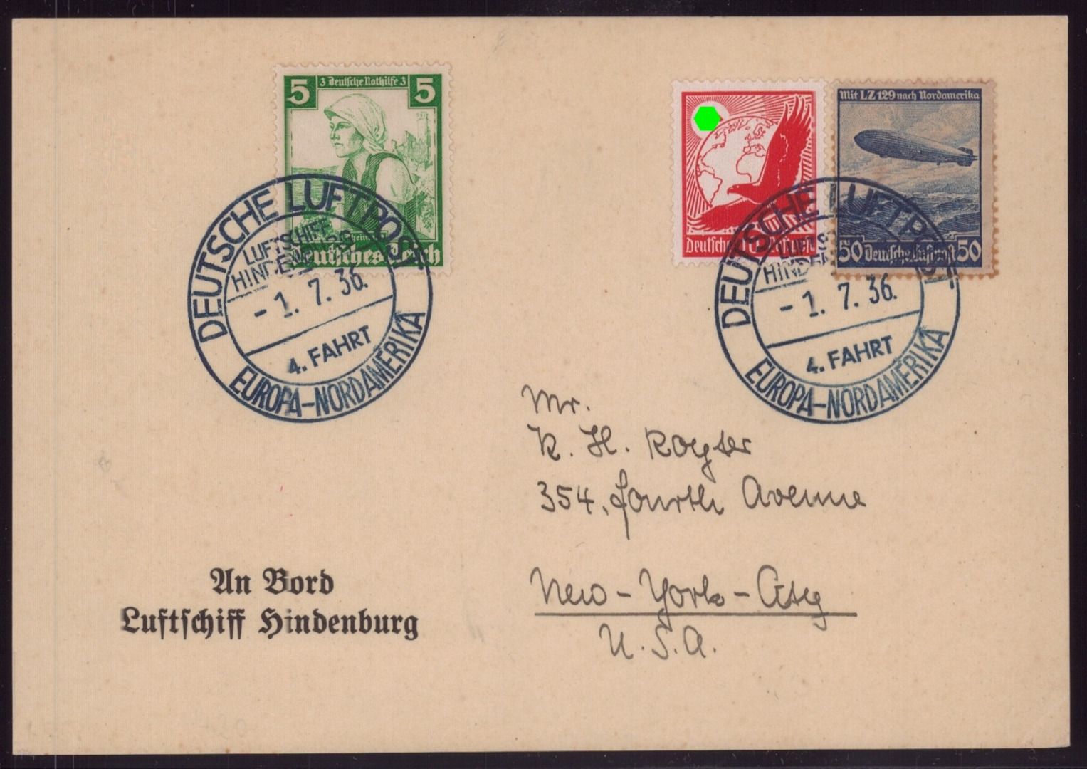 Zeppelin Brief LZ 129 4. Nordamerikafahrt Bordpost 1936 Sieger 420 A